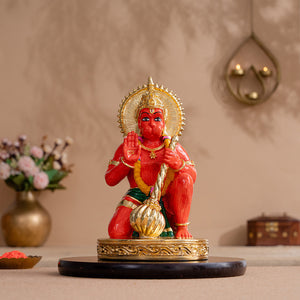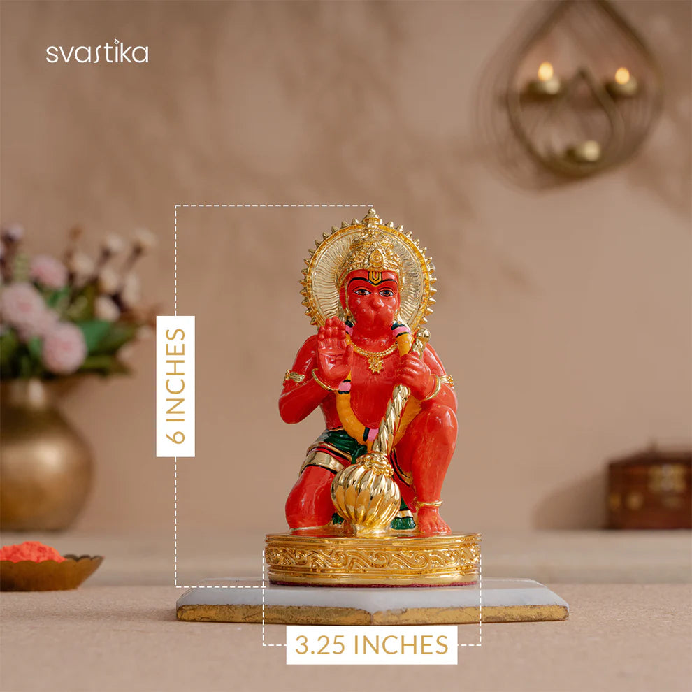 Design: Hanuman Ji in a powerful yet devotional posture, adorned with ornaments and sacred markings